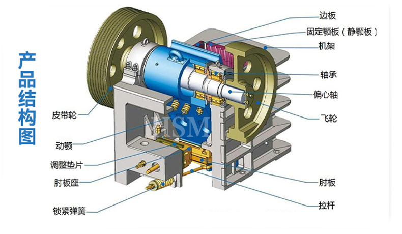 鄂式破石機破碎方式為曲動擠壓型,電動機驅動皮帶和皮帶輪,通過偏心軸使動顎上下運動,當動顎上升時肘板與動顎間夾角變大,從而推動動顎板向固定顎板接近,與其同時物料被壓碎或劈碎,達到破碎的目的;